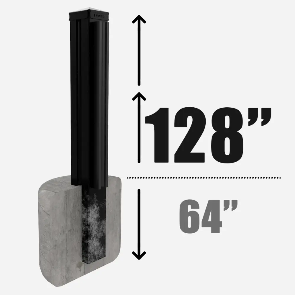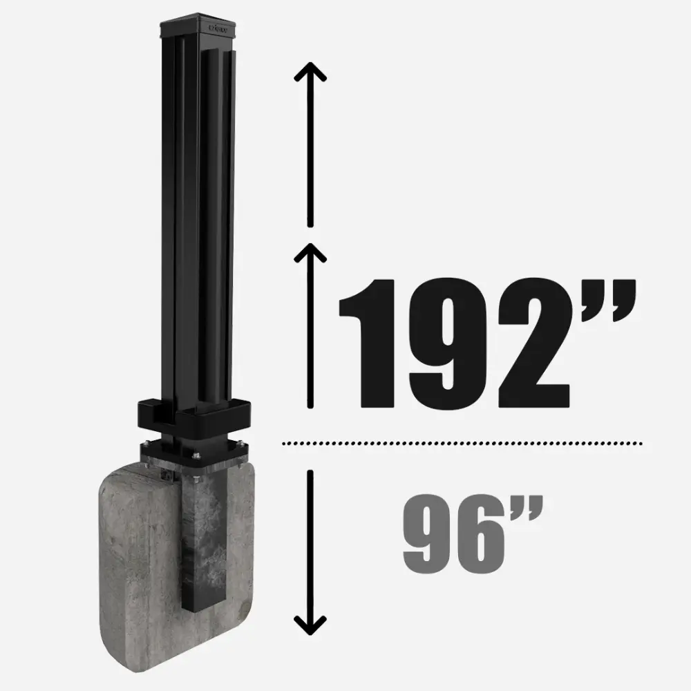 Line post securely mounted on a post base, available in 96”, 126”, 150”, and 192” heights, and is designed for installation on a flat, solid concrete surface.