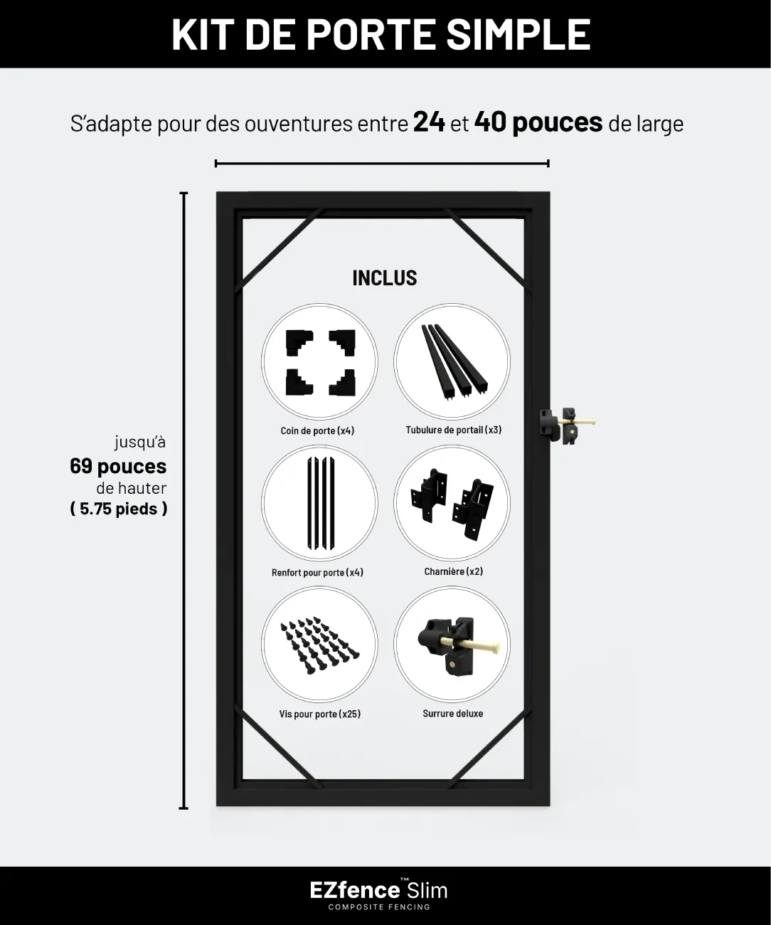 Grâce à son cadre ingénieusement conçu, ce système s’ajuste pour combler des ouvertures allant de 24 à 40 pouces. C’est la solution idéale pour les passages de climatisation, les bacs de recyclage ou les accès secondaires. Sa hauteur de 5 pieds 9 pouces s’aligne sans effort avec vos panneaux EZfence Slim pour garantir une intimité totale et une ligne visuelle épurée.
