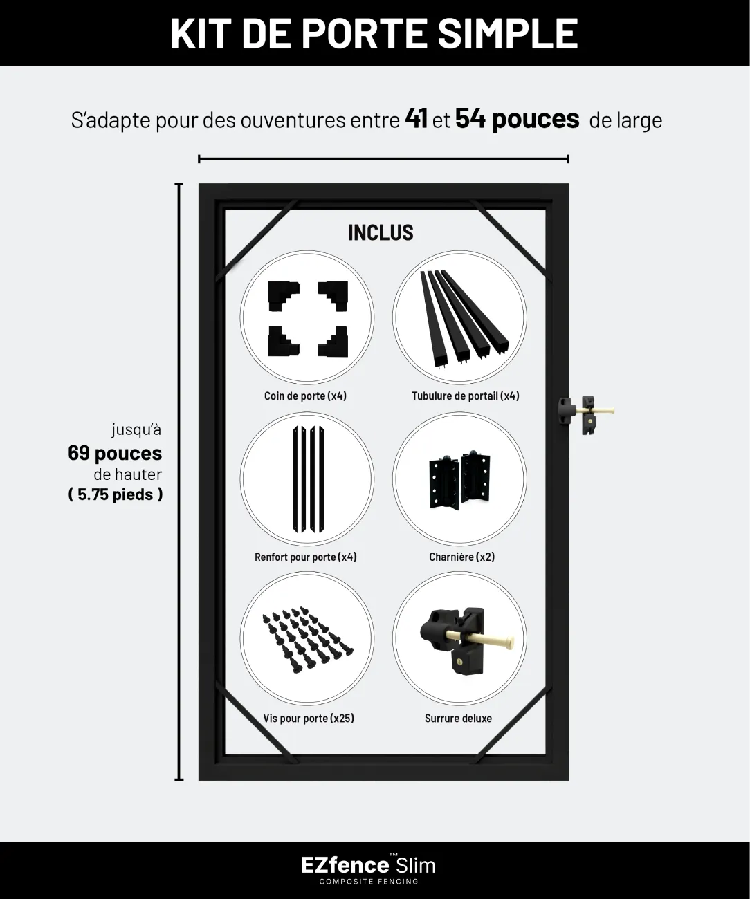 La trousse de porte EZfence Slim est pensée pour le propriétaire qui recherche un résultat professionnel avec une installation efficace. C’est l’option la plus intelligente pour compléter votre projet de clôture avec un fini haut de gamme. Sélectionnez vos propres planches de clôture (vendues séparément) pour harmoniser votre porte au reste de votre aménagement. Profitez d’un système en vinyle et aluminium sans entretien qui valorise votre maison année après année.
