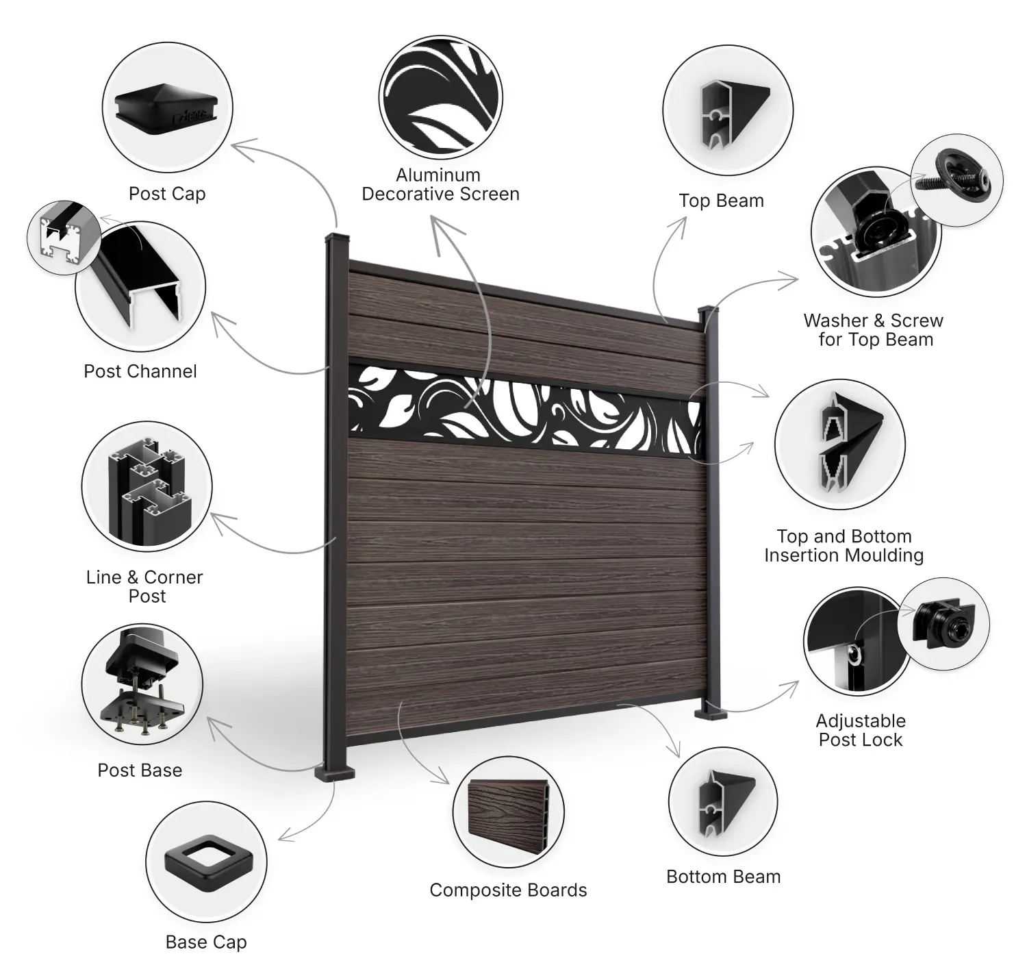 Système de cadre pour clôture mixte permet de combiner des planches verticales et horizontales au sein d’un même panneau pour un design unique et personnalisé. L’ensemble comprend des moulures supérieure et inférieure avec braquettes de soutien pour maintenir les planches verticales, ainsi qu’un profilé central en « H » avec capuchons, servant de jonction polyvalente pour accueillir l’orientation de votre choix.