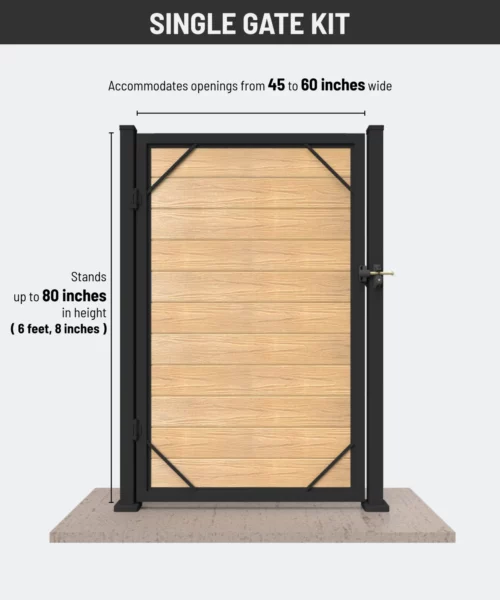 Upgrade your home’s fencing with our high-quality composite gate kits. The Single Folding Gate Kit allows you to create a personalized gate with a width of up to 52 inches and a height of up to 6 feet. For even more coverage, our Double Fence Gate Kit offers a width of up to 120 inches. Both kits are built with durable aluminum piles for added strength and stability. Choose from a variety of color options to match your composite fencing system and create a cohesive look for your outdoor space. Order your gate kit today and add both style and function to your home’s fencing.