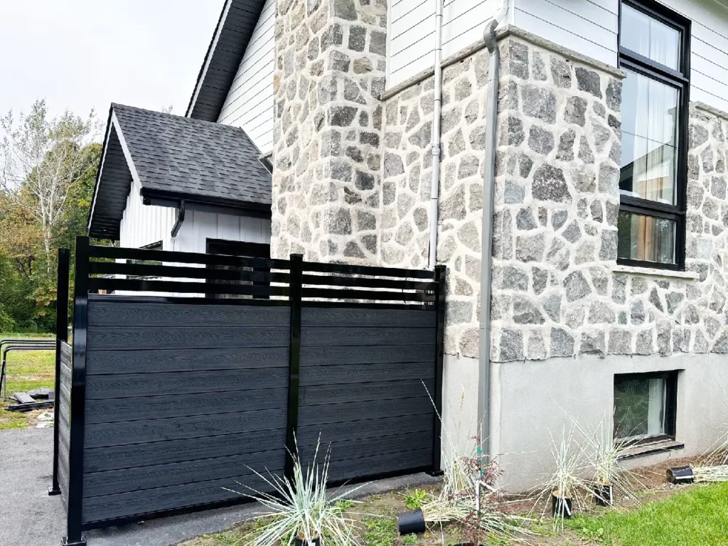 Choose EZfence HD for serious strength! Its Natural HD composite boards (9″ H x 1-3/8″ T x 116″ L) and 6″ x 6″ posts soar to 15′, span 120″, and withstand 135 km/h winds. In Premium Matte Black with 10′-wide swing gates.