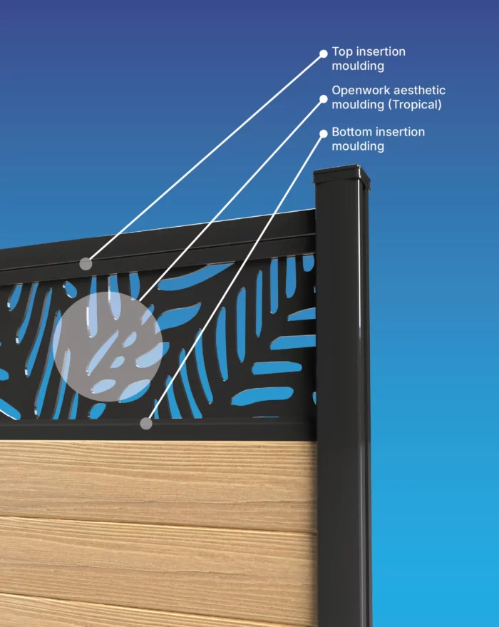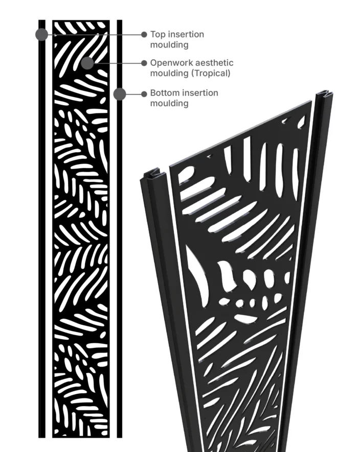 Our openwork moulding in black aluminum gives a great visual impact to your fence. The laser-cut fence panel comes in 80 inches in length and 12 inches in width.
