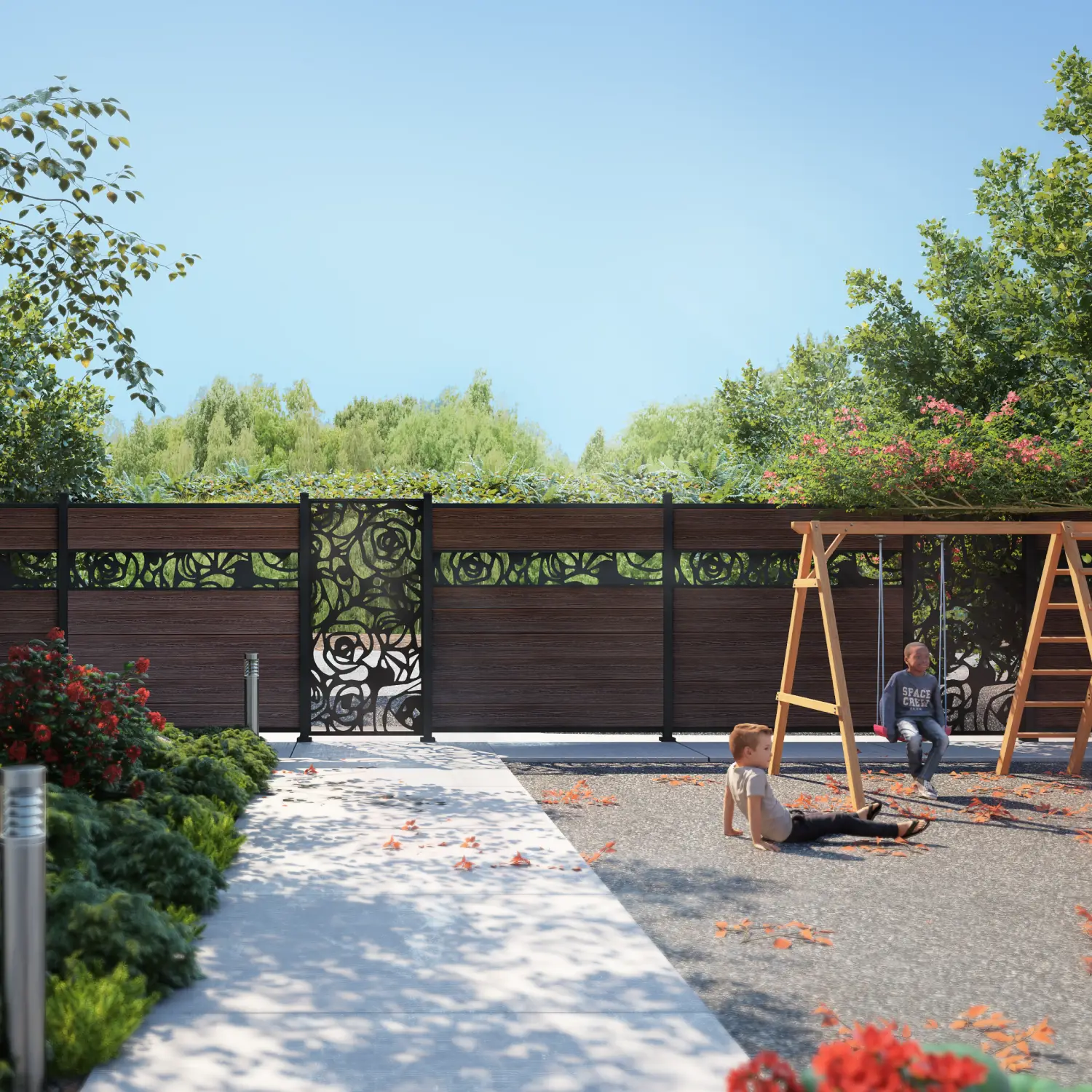 Its sleek panels and matching gates are optimized to reduce cutting and waste, ensuring clean, efficient installations even in compact spaces like pergolas, narrow side yards, or small patios.