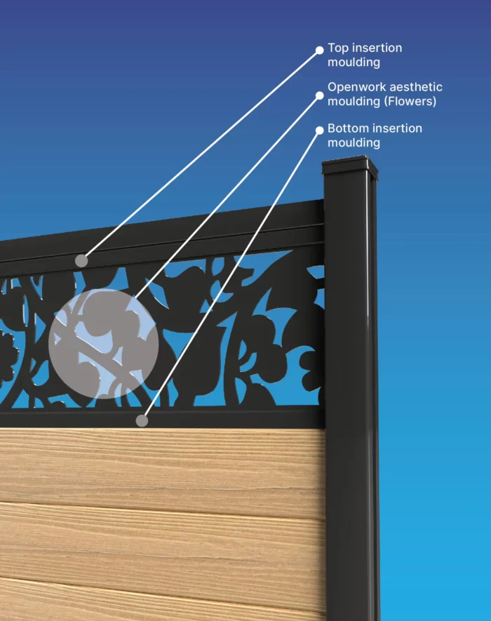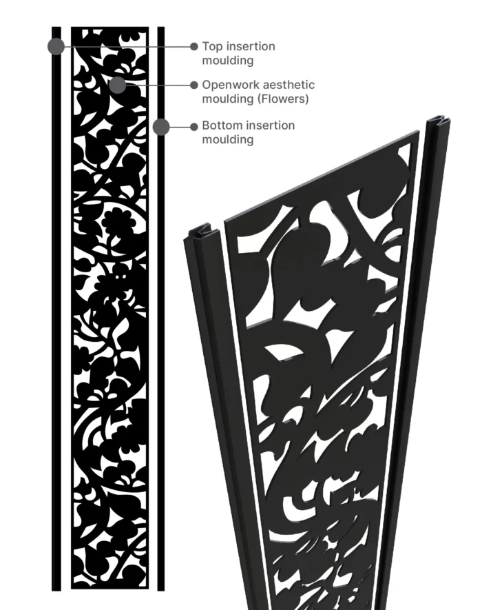 Our openwork moulding in black aluminum gives a great visual impact to your fence. The laser-cut fence panel comes in 80 inches in length and 12 inches in width.