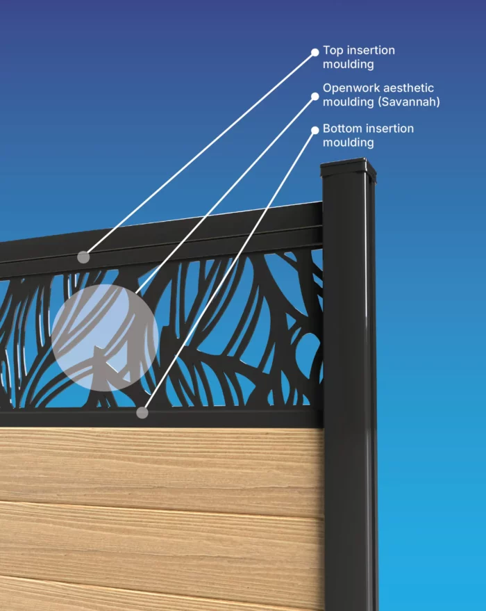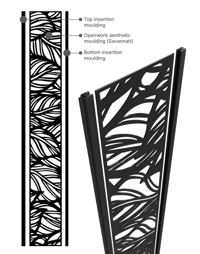 Our openwork moulding in black aluminum gives a great visual impact to your fence. The laser-cut fence panel comes in 80 inches in length and 12 inches in width.