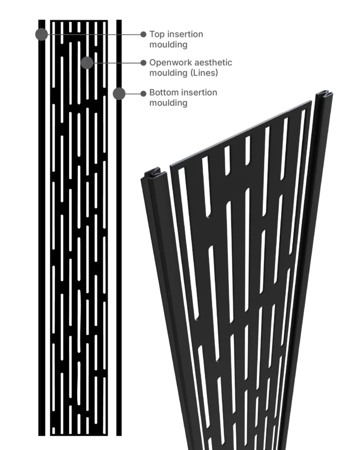 Our openwork moulding in black aluminum gives a great visual impact to your fence. The laser-cut fence panel comes in 80 inches in length and 12 inches in width.