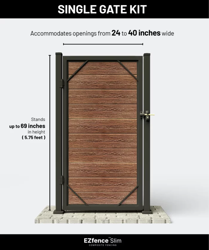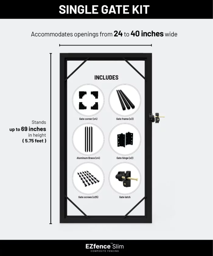 - This kit is designed for quick and easy assembly, so you can build your gate right away. The EZfence Slim Single Gate Kit also offers endless possibilities for customization. You can choose your own fence boards (sold separately) to create a gate that complements your existing fence and expresses your personal style.